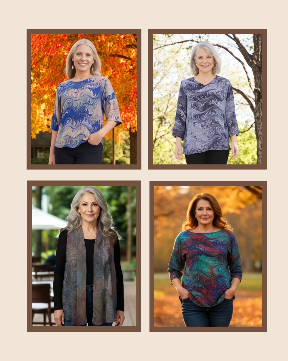 For 25+ years, I have marbled and dyed one of a kind fabrics - I have always loved fabric and being able to create my own images with dyes and paints is my passion! I cut and sew these gorgeous fabrics into fun and colorful clothing for women who LOVE DIFFERENT!!