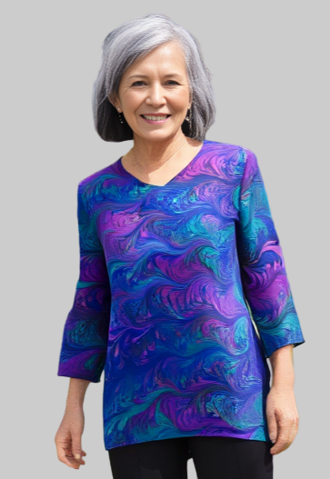 Silk crepe de chine v-neck with 3/4 length sleeves. Drapes beautifully with a nice relaxed fit. Effortlessly move from dressy to casual look.
