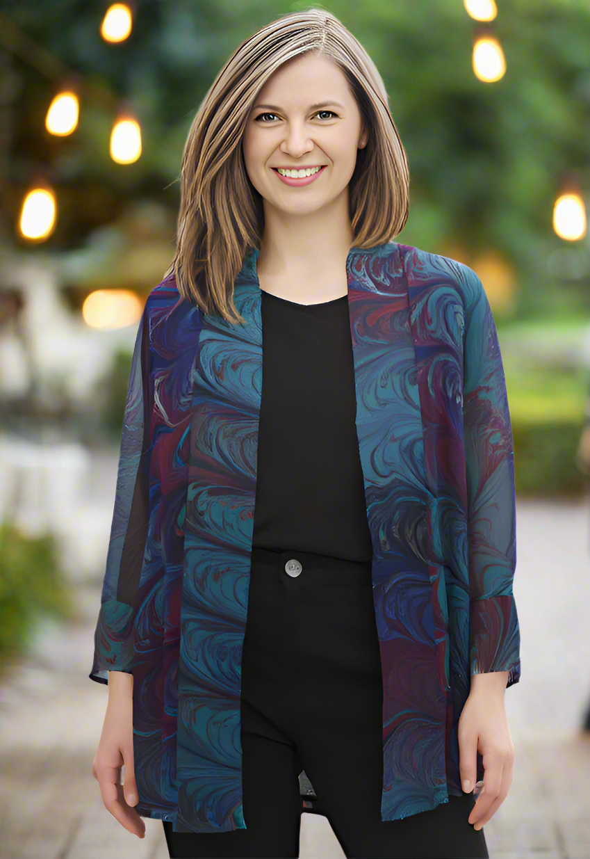 This is a hand marbled garment, one-of-a-kind created in my studio. You will love these features: