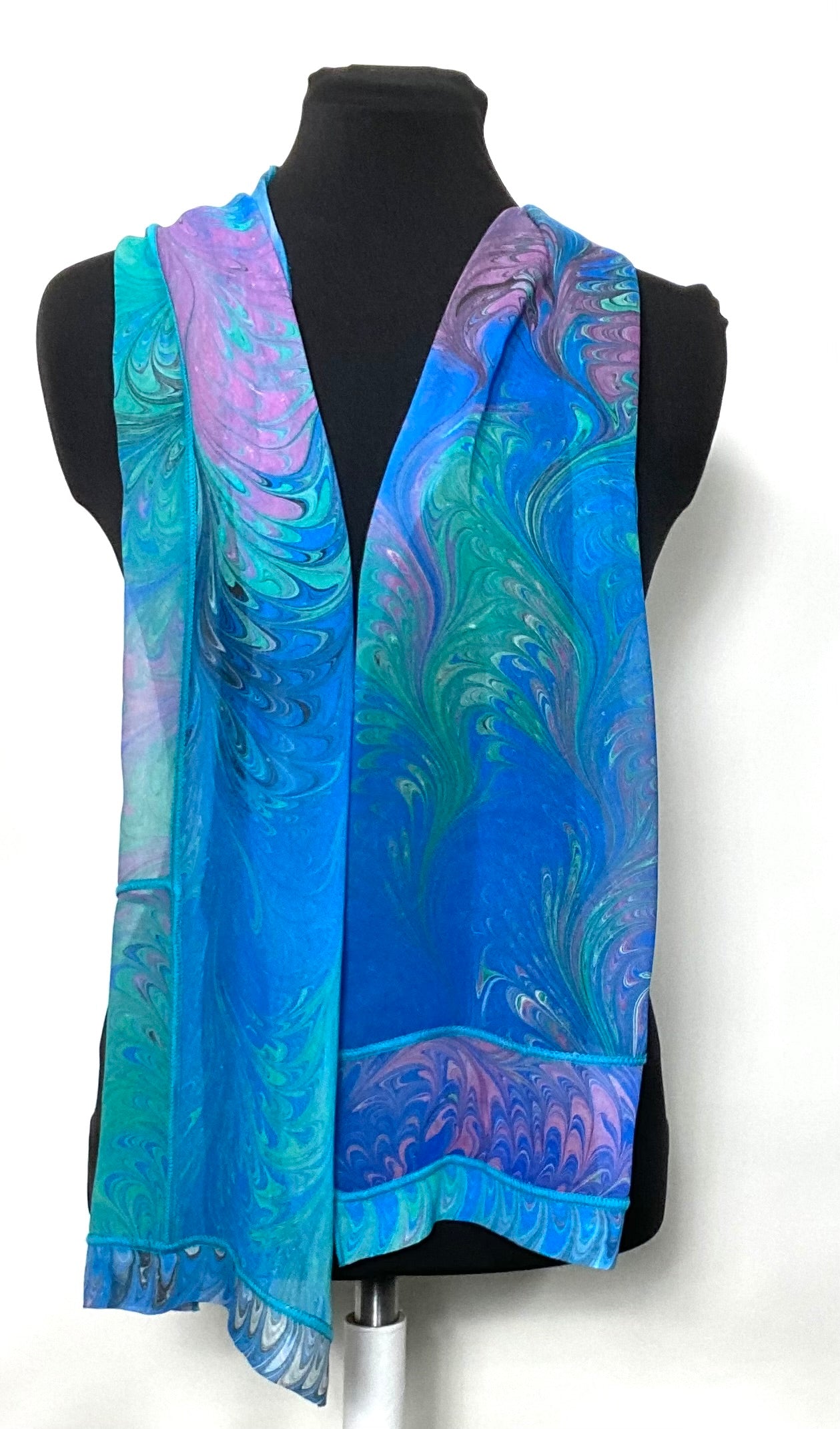 This scarf was created by sewing together gorgeous marbled and dyed silk chiffon pieces. Decorative stitching in a complementary aqua color enhances the details of this scarf.