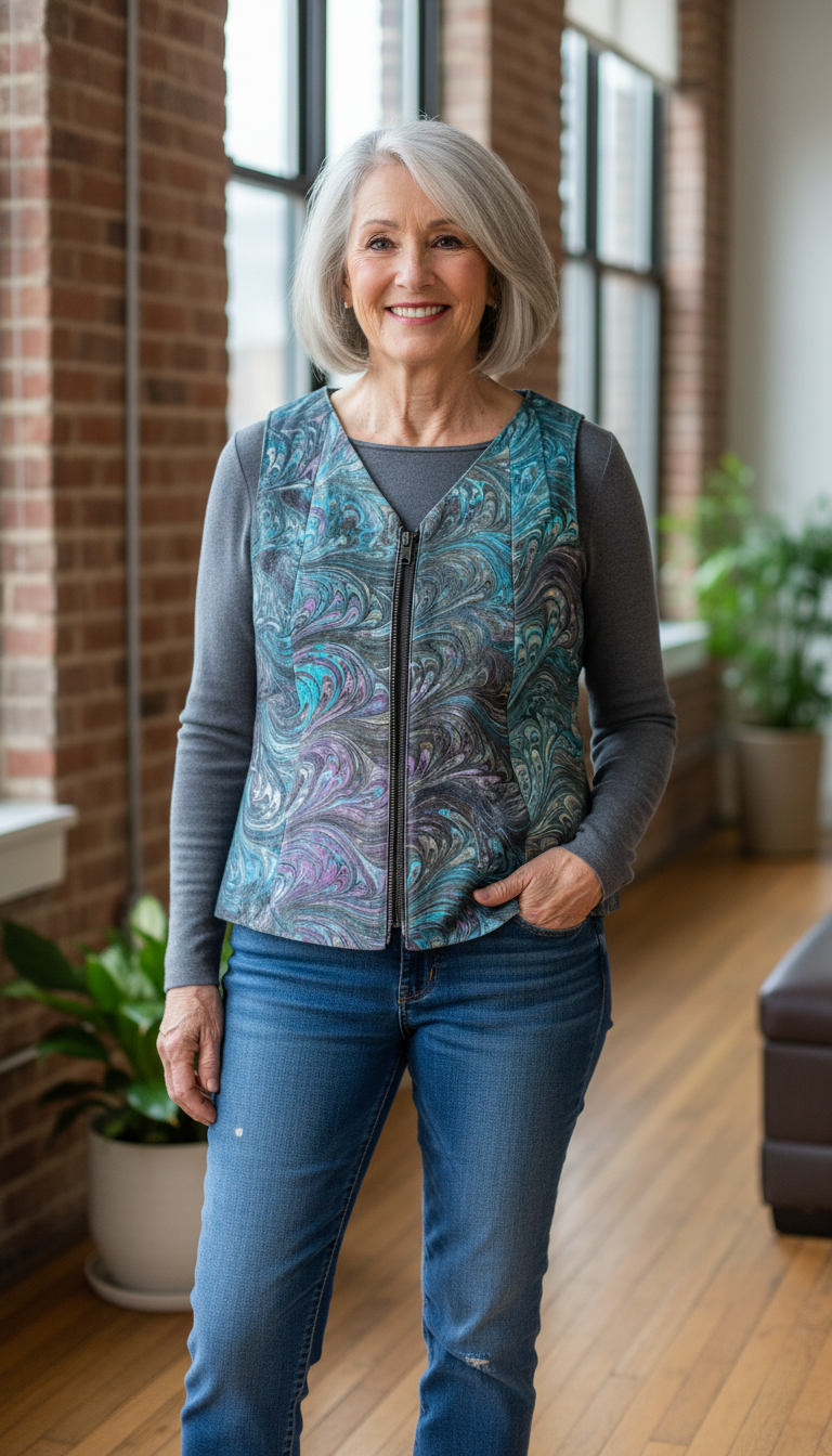 Gorgeous marbled leather vest created from upcycled materials. The leather came from a men's jacket that I cut apart. I marbled the pieces from the jacket and then cut and sewed those pieces into this gorgeous vest.