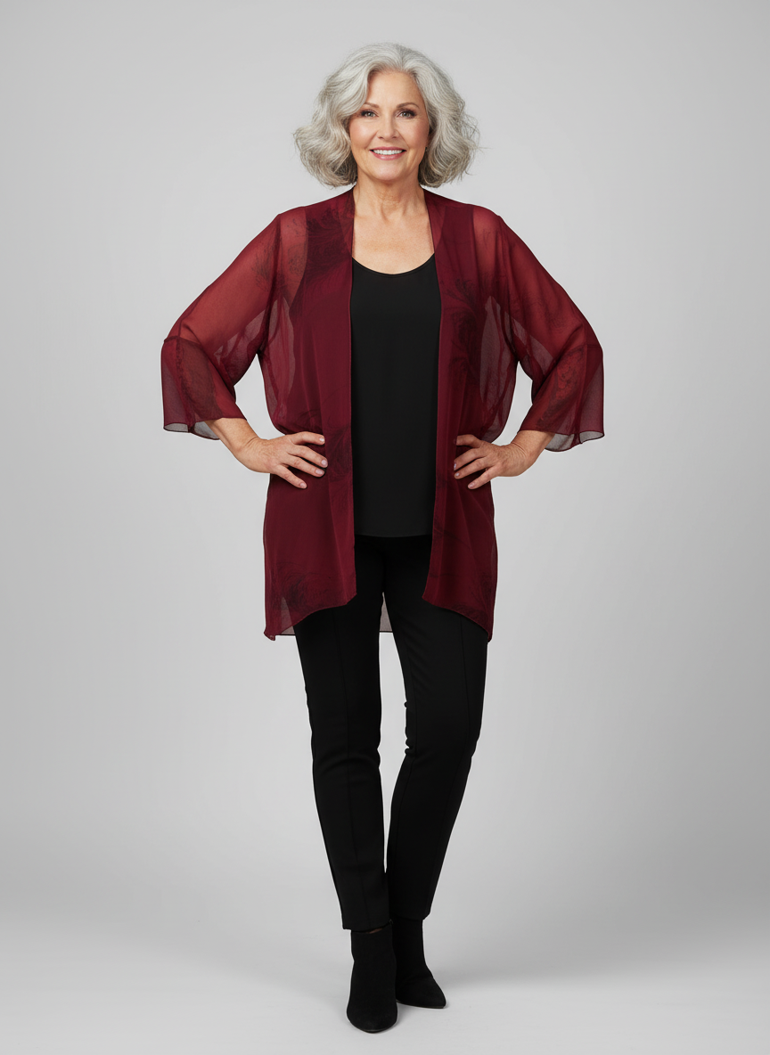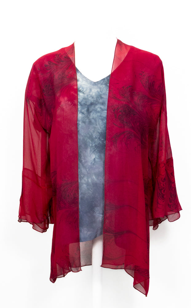This is a sheer 100% silk chiffon mid thigh length jacket. It has a flowing drape with 3/4 length sleeves and is marbled in a soft red and black feathered pattern. This jacket will comfortably fit up to a 45" bust and hip. Jacket Length is 29".