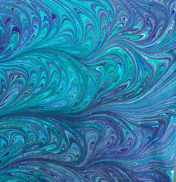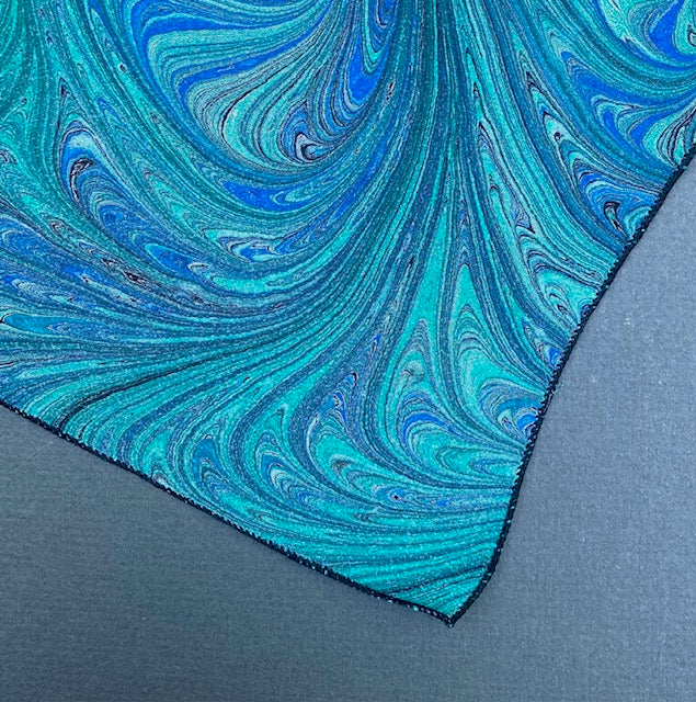 One-of-a-Kind Marbling – Hand-dyed and marbled in soft ocean colors, this scarf is an original masterpiece.